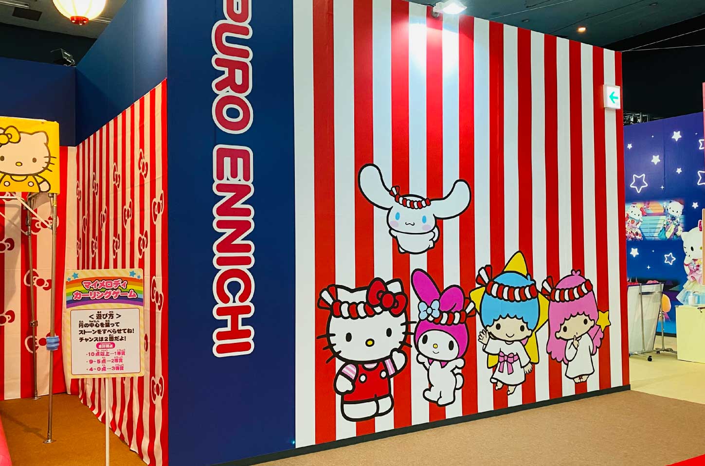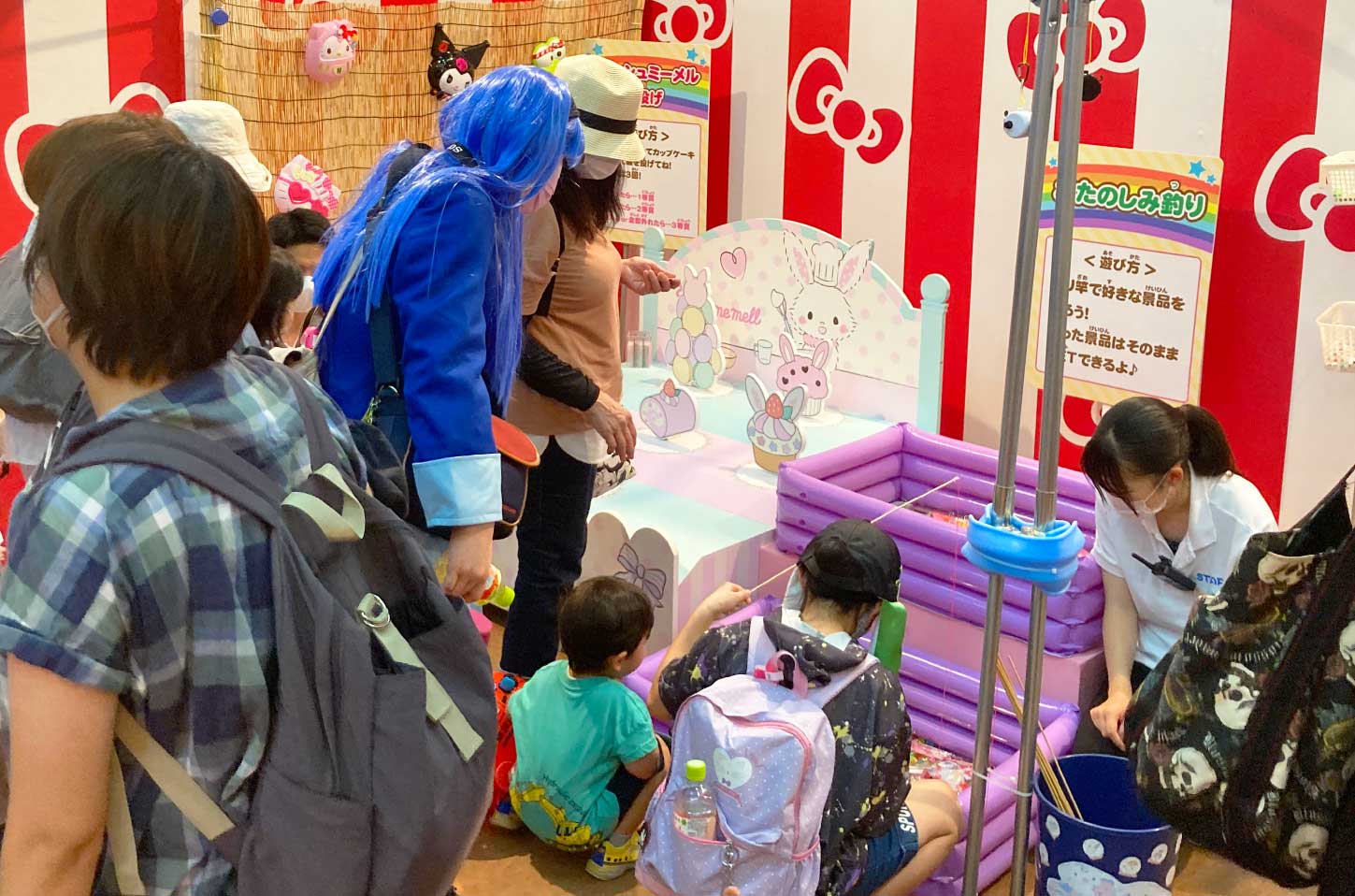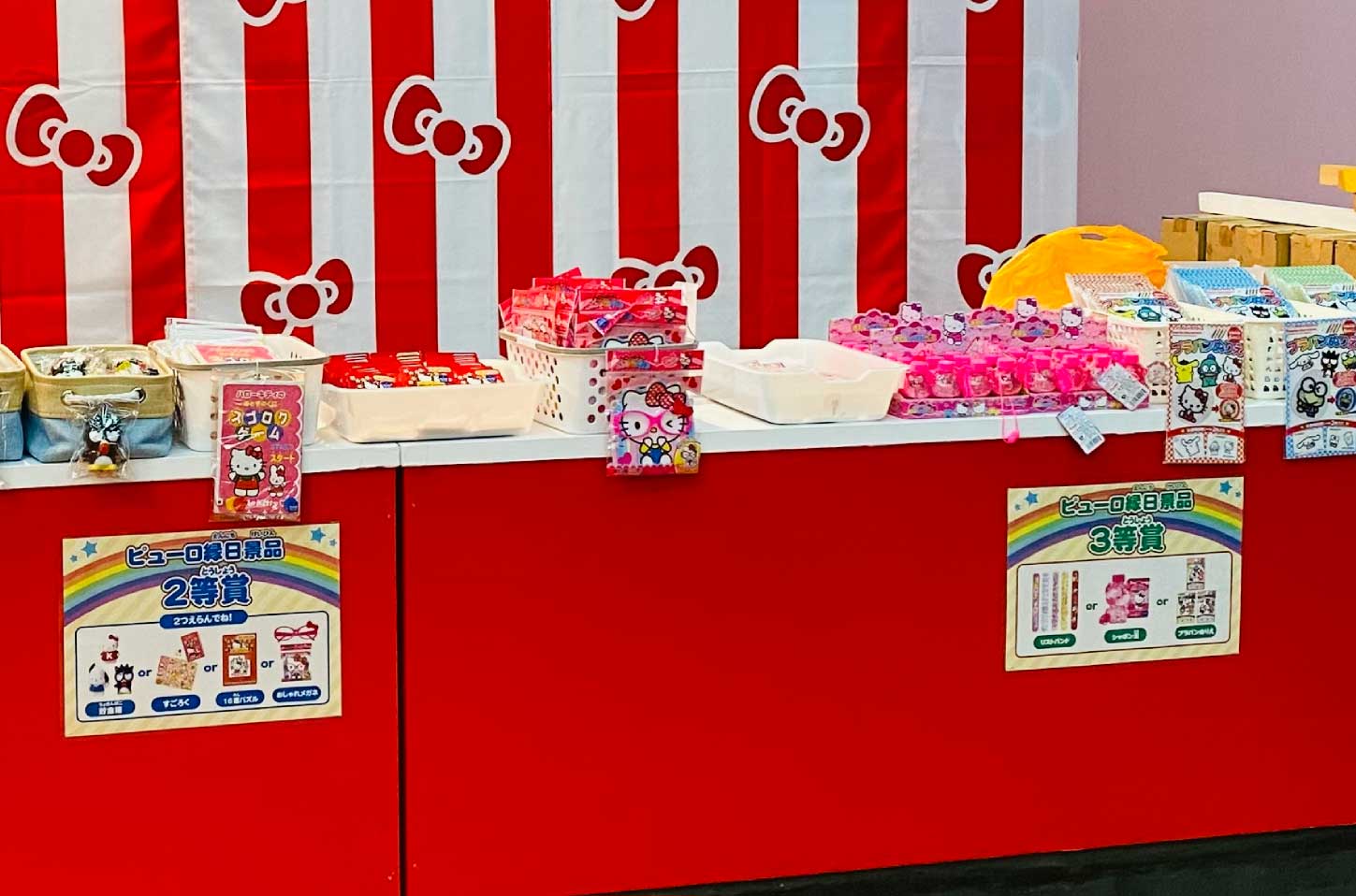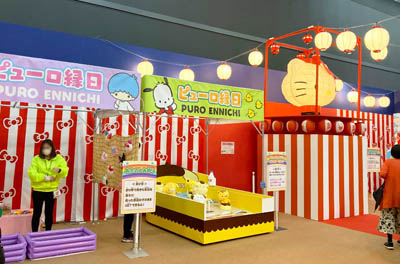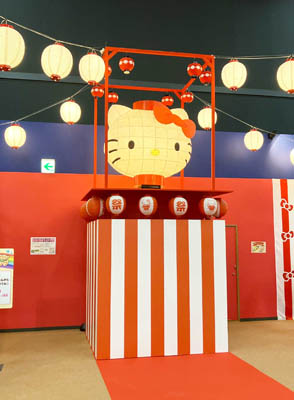 大きなハローキティ提灯が目を引くレトロな縁日ゲームエリア。キャラクターがデザインされたゲームに挑戦して高得点を目指そう! (必ず景品がもらえるよ!)